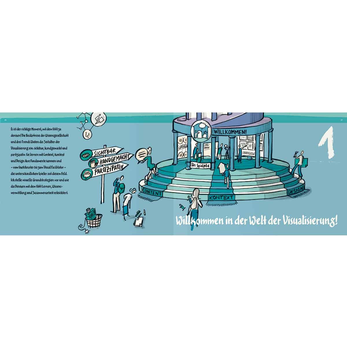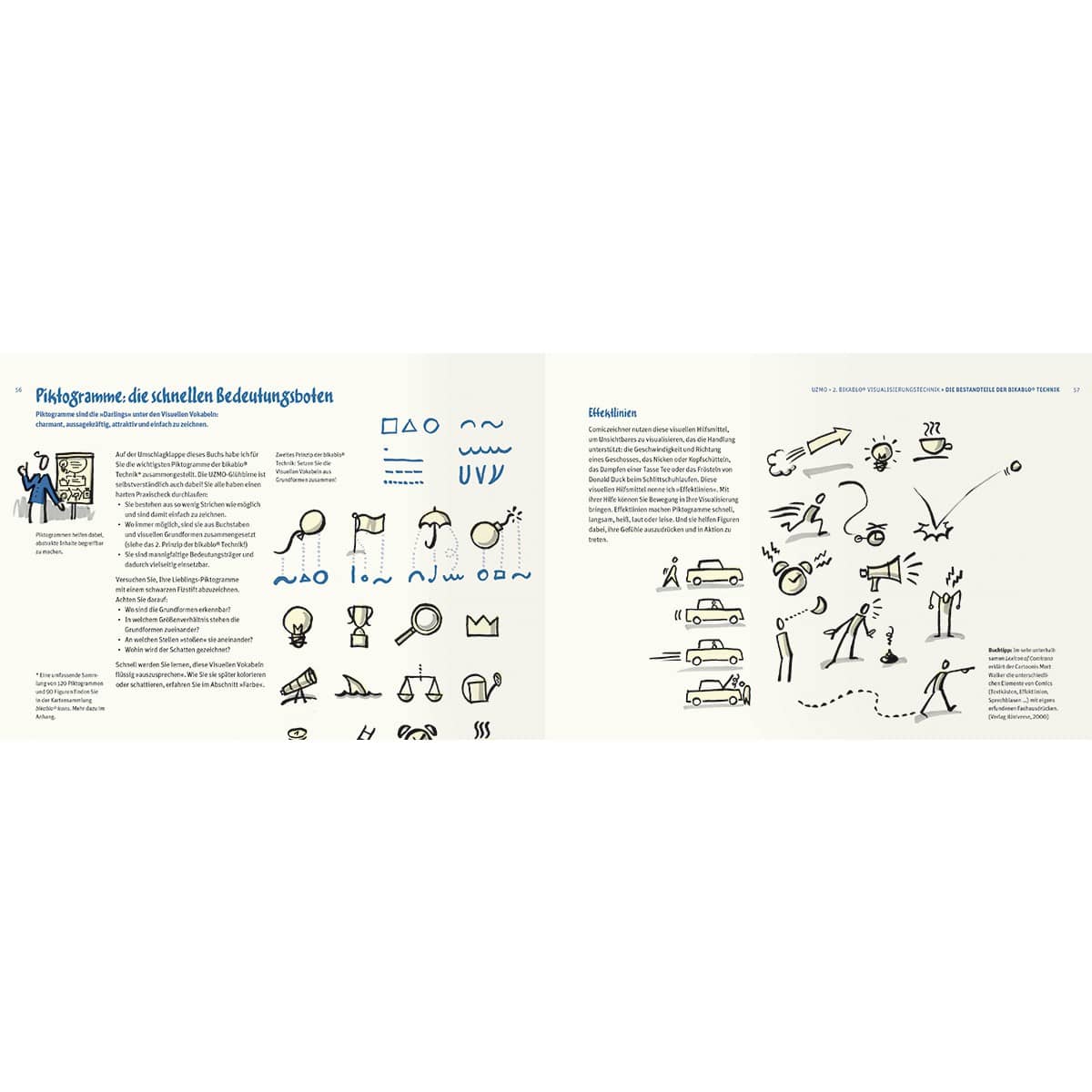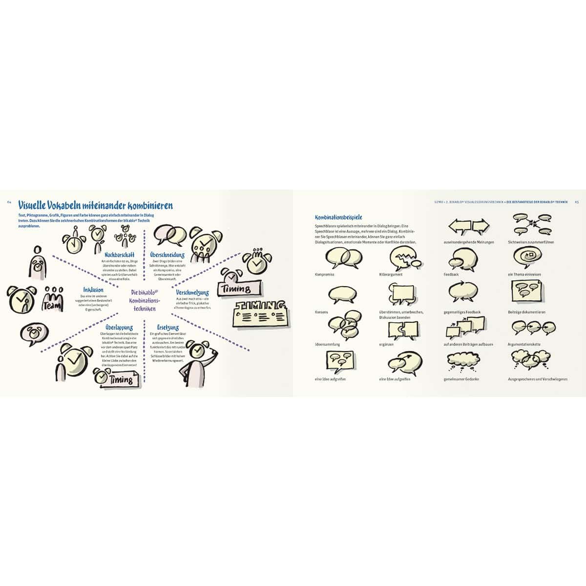 Die Visualisierungstechnik, die Sie aus der bikablo® Reihe kennen, bildet die Grundlage. "Die Visuellen Wörterbücher sorgen für das Bildvokabular. Unsere Trainings sind die Sprachkurse. UZMO ist nun das langersehnte Sprachbuch der Visualisierung", so verortet Martin Haussmann, Autor von "UZMO – Denken mit dem Stift" sein neues Buch im bikablo® Universum.
