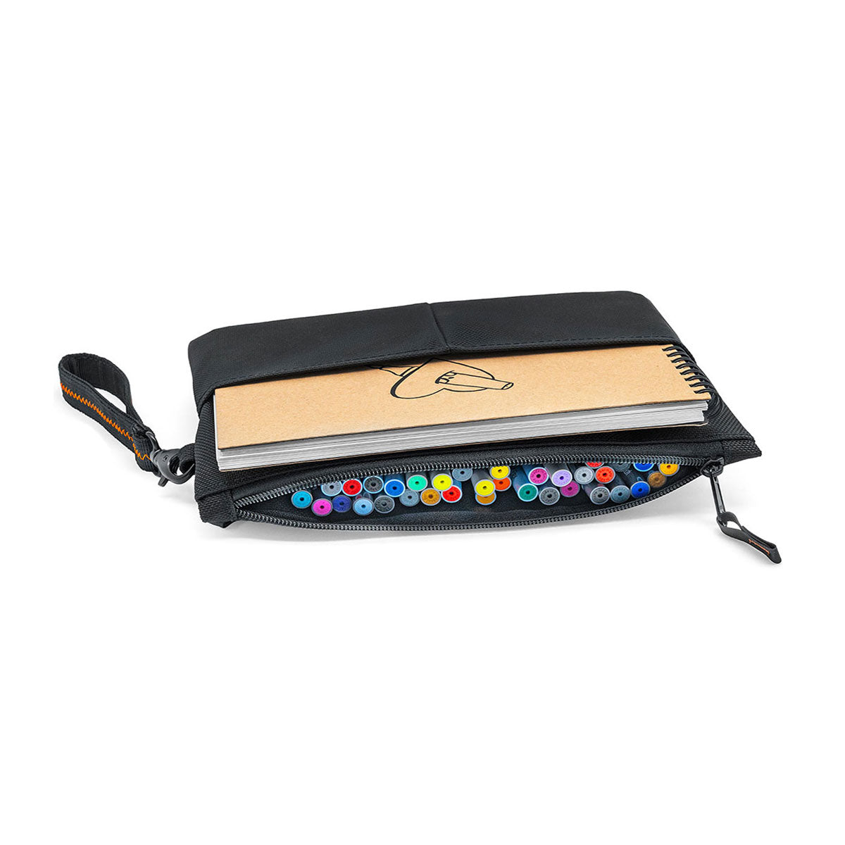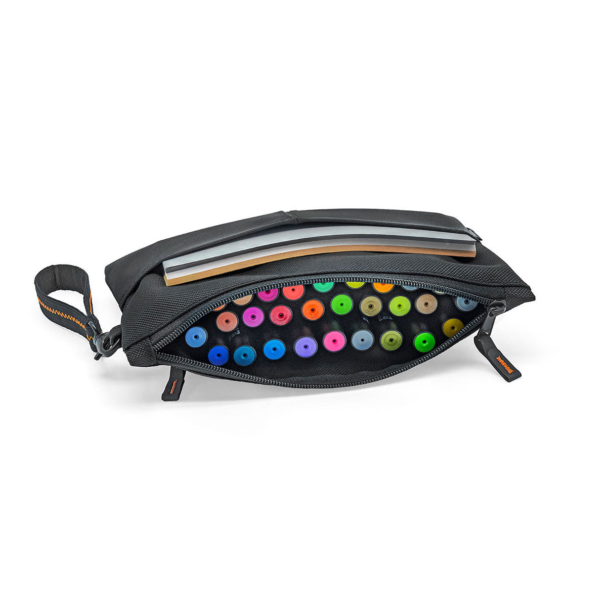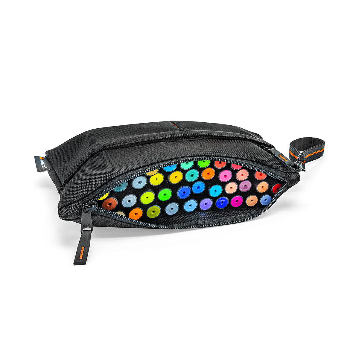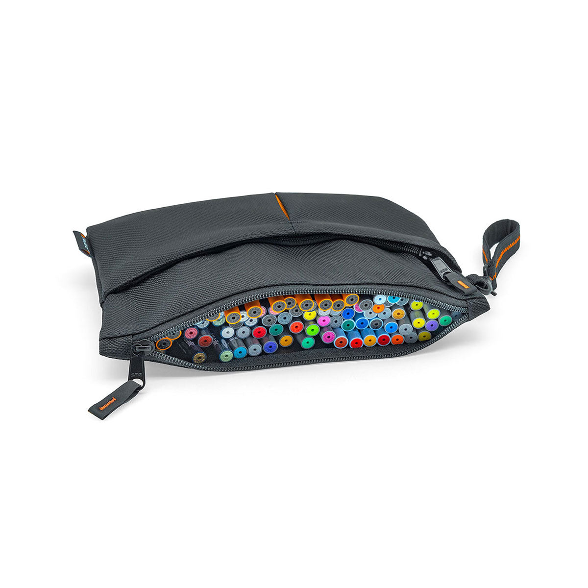 Step up your maker organization with the sophisticated black marker case with its many design elements: embroidered zippers in vibrant orange, a handle loop with a black carabiner and zigzag stitching, and a color-blocked fold in the extra compartments. This spacious standout case is ideal for professionals, artists, or students who require a versatile and convenient storage solution.