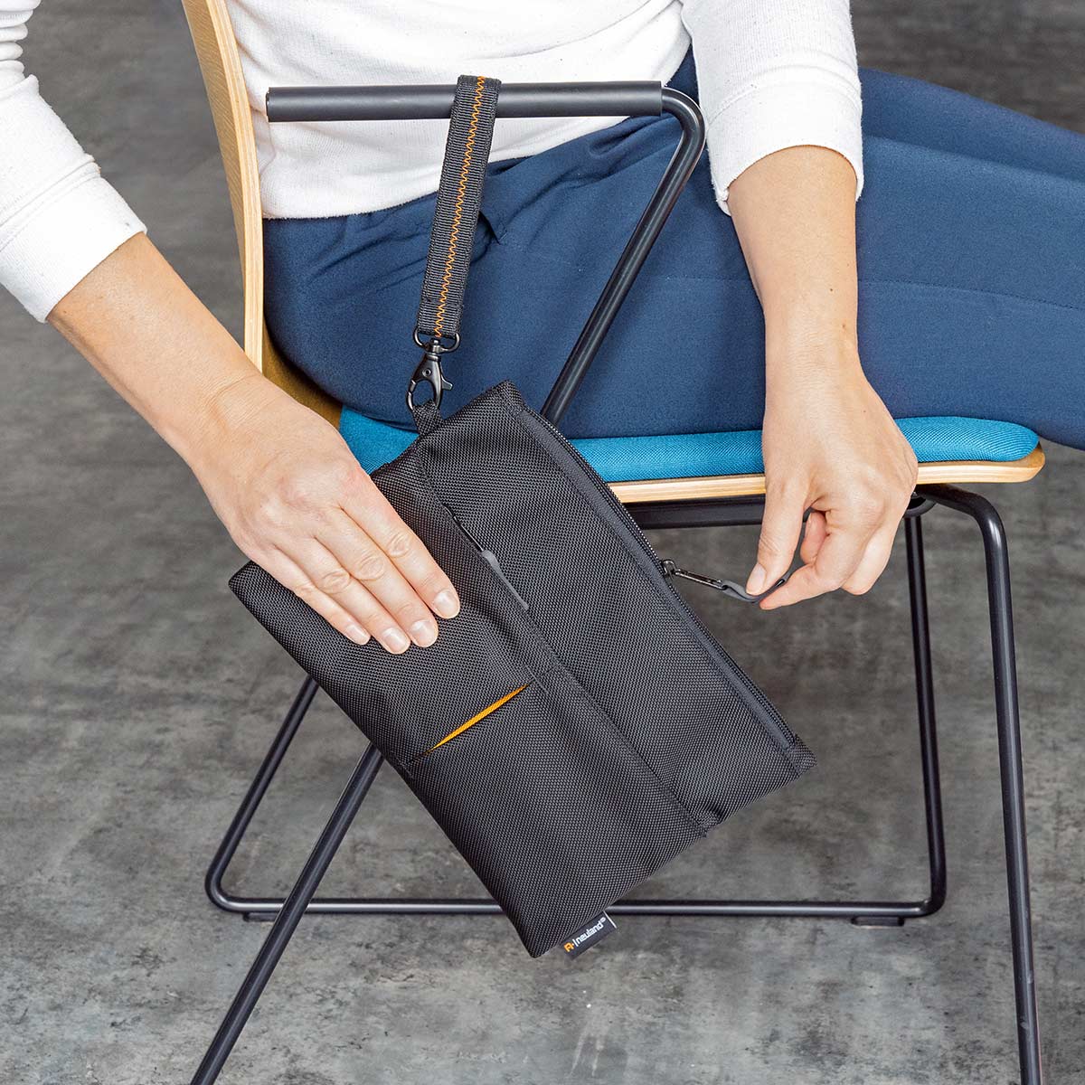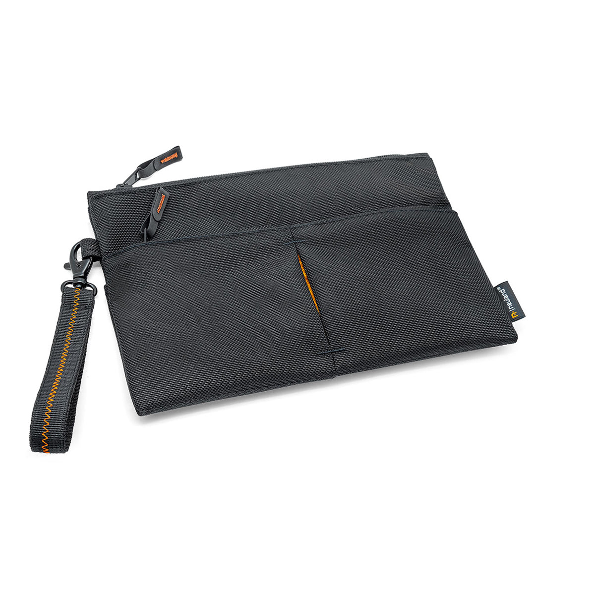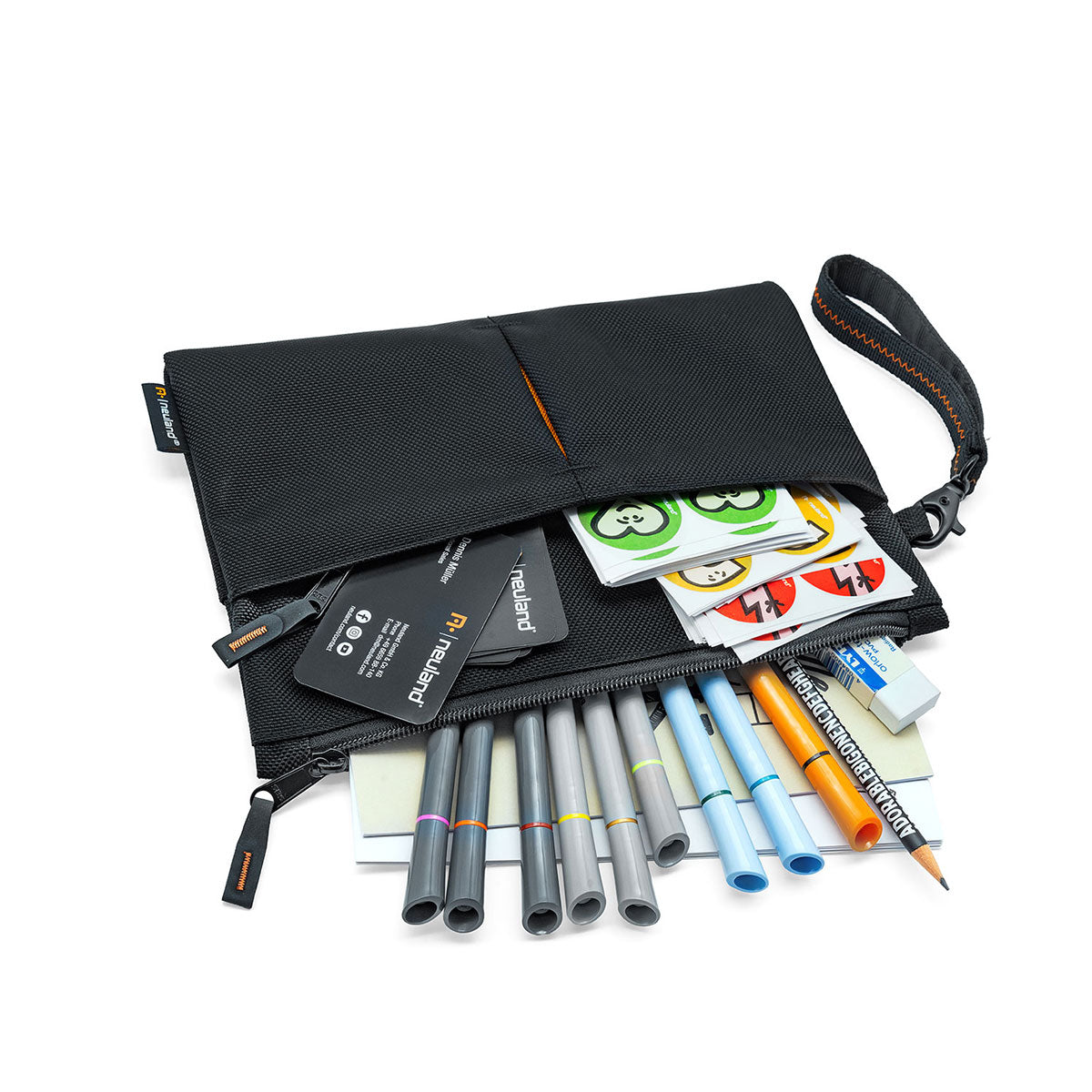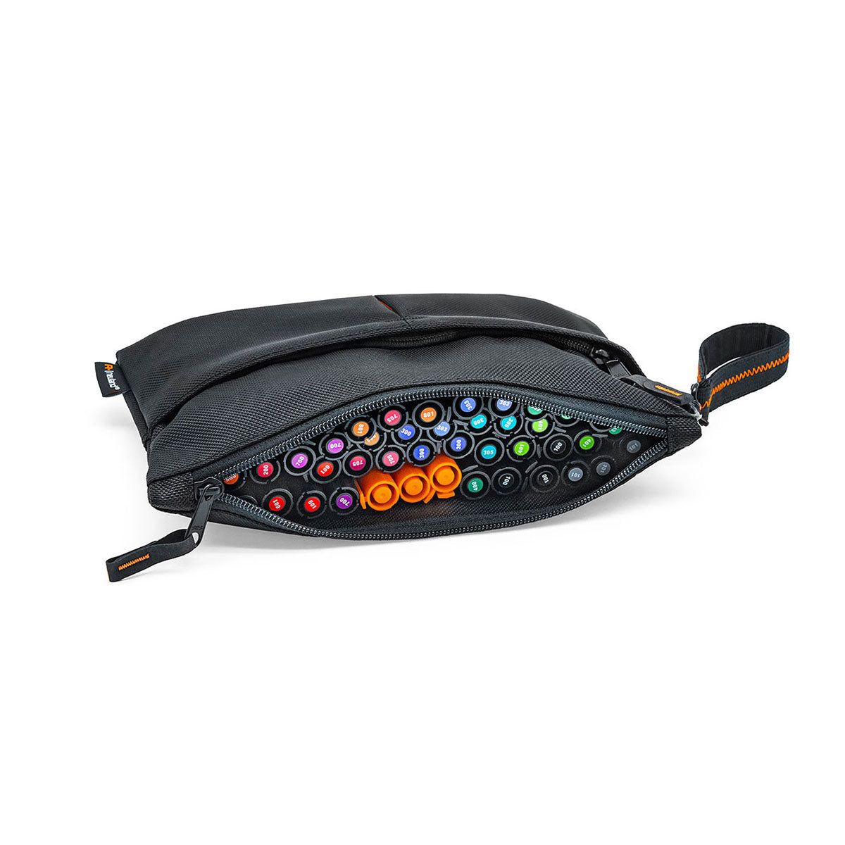 Step up your maker organization with the sophisticated black marker case with its many design elements: embroidered zippers in vibrant orange, a handle loop with a black carabiner and zigzag stitching, and a color-blocked fold in the extra compartments. This spacious standout case is ideal for professionals, artists, or students who require a versatile and convenient storage solution.