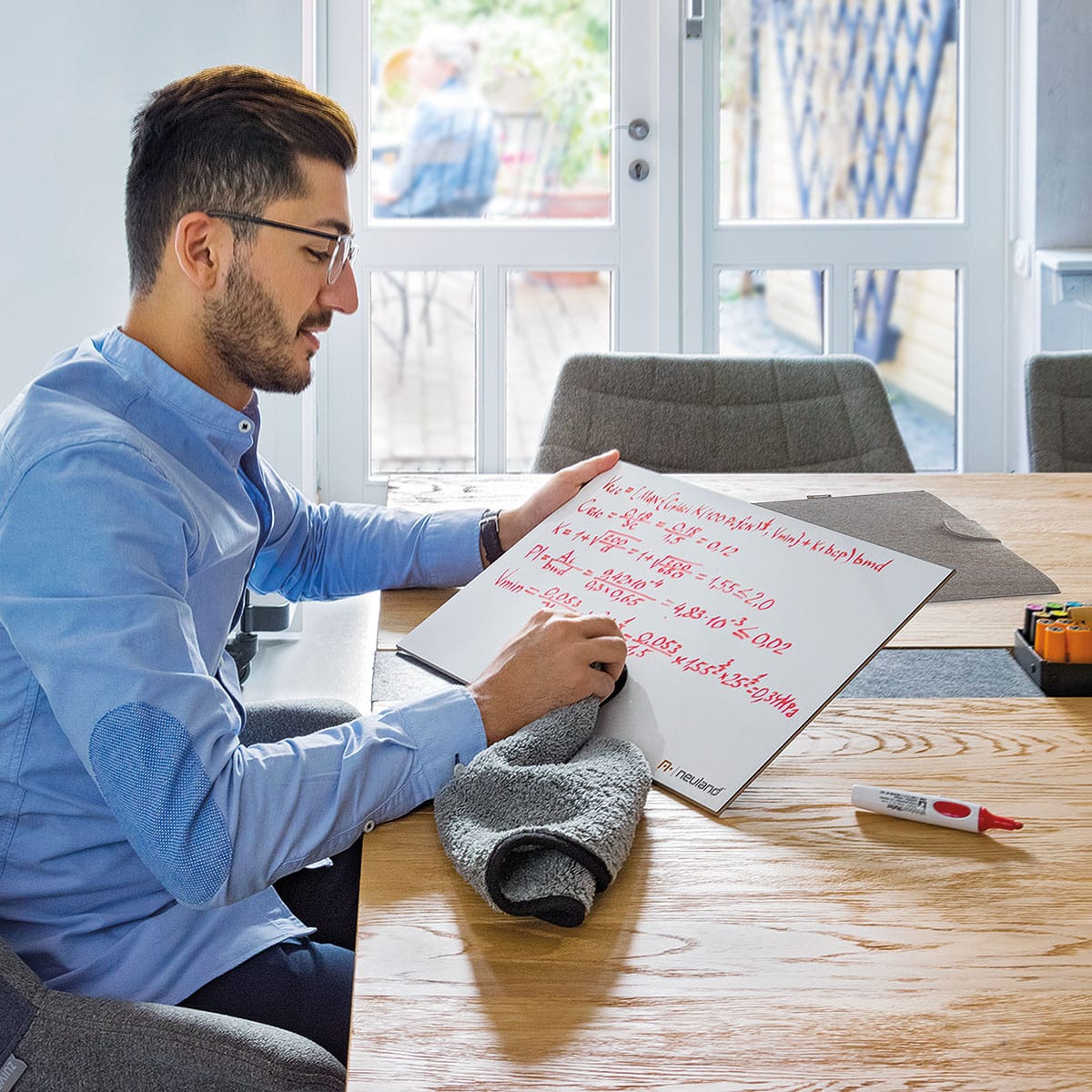 myWorkBoard WB heeft geen batterijen, heeft geen oplader nodig en je kunt er zonder vingerbewegingen mee werken. Het enige wat je nodig hebt is een whiteboard marker, bijvoorbeeld onze Neuland FineOne® Whiteboard. En werken met de myWorkBoard WB wordt nooit saai. Afhankelijk van je stemming gebruik je hem als bureau als je op papier wilt werken, of als klein whiteboard. De "gegevens" kunnen worden verwijderd met onze briljante microvezel-reinigingsdoek door eenvoudig met uw hand te vegen. Het is het ideale hulpmiddel voor individueel werk, maar ook voor teamwork. Of het nu gaat om workshops en trainingen, b.v. voor introductierondes, op BarCamps of in geconcentreerde individuele werkfasen – myWorkBoard WB is geschikt voor tal van toepassingen.
