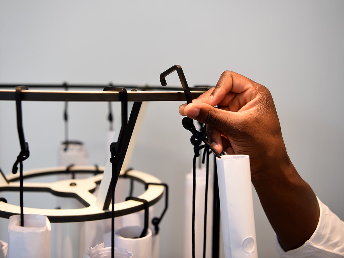 Wikkel eerst de papierrollen met de paracord-sling (Chartloop), druk op de koordstopper en trek het paracord strak aan. Schuif vervolgens de grote stop van de ChartHook op het lange paracord door de opgerolde kaart. Een korte trek aan de haak lijnt de stop uit zodat het opgerolde papier erop kan liggen. Zet de string op de lengte van de grafiek – klaar. Met de haak aan de bovenkant van het paracord worden zelfs zware papierrollen veilig aan de Charterobe® gehangen. Tot 40 ChartHooks kunnen op de Charterobe® geplaatst worden.