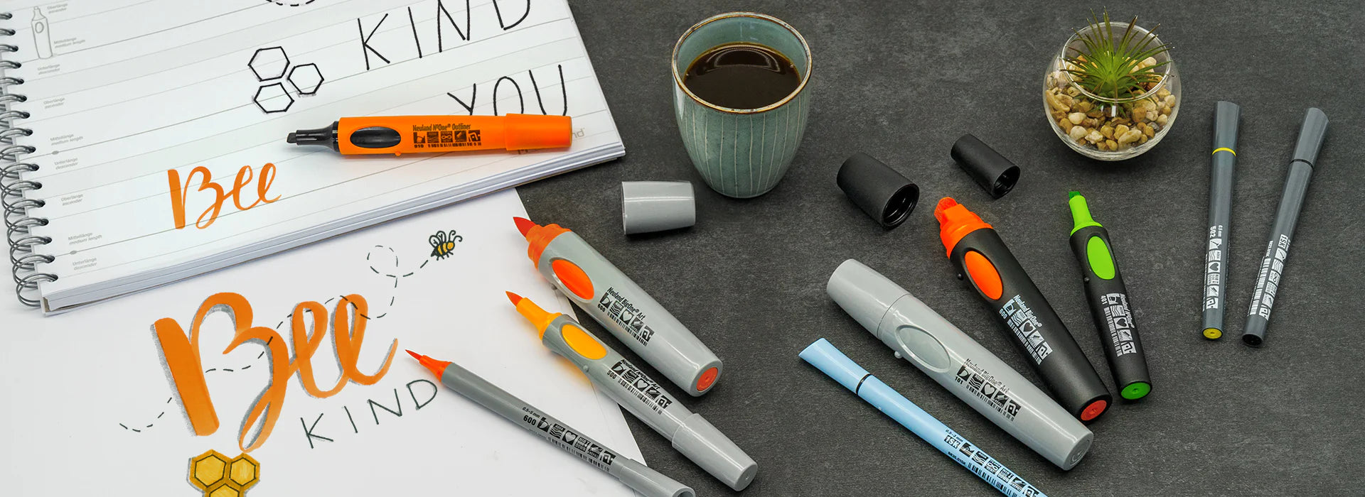 Bei Neuland findest du wasserbasierte, nachfüllbare Marker in allen Größen und zahlreichen Spitzen-Variationen – ob für dein Sketchbook oder großformatiges Arbeiten auf der GraphicWall. Dabei kannst du jeden Marker mit derselben Tinte nachfüllen. Das heißt: eine Nachfüllflasche passt für zehn verschiedene wasserbasierte Marker-Typen.