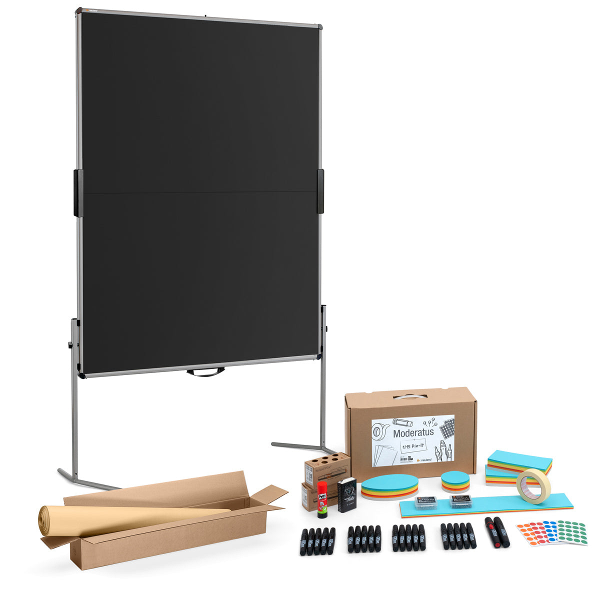 Das Moderationsmaterial-Set wird in einem praktischen Papp-Koffer geliefert und beinhaltet ausreichend Moderationsmaterial für einen intensiven 1-Tages-Workshop mit 15 Teilnehmenden. In der Praxis sind aber durchaus mehrere moderierte Besprechungen mit kleinen Teams damit durchführbar. Die im Set enthaltenen Marker sind alle nachfüllbar.